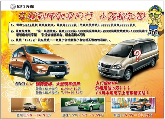 為慶祝景逸1.5XL上市一周年,慶祝景逸LV南寧坤馳上市,以及迎接9月北部灣車展,風(fēng)行汽車南寧坤馳店特推出車展千元購車代金券,即日起所有客戶都可到店免費(fèi)領(lǐng)取,凡是在車展期間于南寧坤馳購買風(fēng)行汽車出示此券的客戶即可在車款上立減1000元現(xiàn)金,車型不限(包括風(fēng)行汽車全系菱智、景逸、景逸1.5XL、景逸LV等)。南寧坤馳店代金券數(shù)量有限,先到先得,發(fā)完為止,具體情況請詳詢風(fēng)行汽車南寧坤馳店。