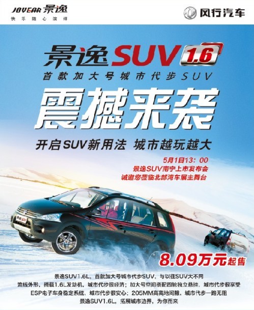 百公里綜合油耗6.6L,不足傳統(tǒng)SUV油耗的70%,首款達到節(jié)能惠民補貼標準。憑借出色的節(jié)油性,風行汽車推出的景逸SUV,在北京車展上大放異彩。繼北京車展上市后,南寧將于5月1日在北部灣車展主舞臺上市,上市當天購車有驚喜大禮,詳詢景逸SUV樣板經(jīng)銷商------南寧坤馳秀廂4S店,0771-5688996。
