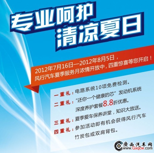 “360O體驗(yàn),360 O關(guān)懷”客戶溫馨服務(wù)工程,風(fēng)行汽車客戶四級(jí)服務(wù)月關(guān)懷活動(dòng)――“專業(yè)呵護(hù)清涼夏日”2012夏季服務(wù)月活動(dòng),7月16日~8月5日南寧坤馳開(kāi)啟,用“專業(yè)的手關(guān)愛(ài)的心”為您的愛(ài)車保駕護(hù)航。