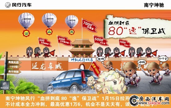 1月19日、20日南寧坤馳秀廂4S店血拼到底 80“逸”保衛(wèi)戰(zhàn)活動(dòng)的首戰(zhàn)已經(jīng)告捷,本周末(1月26-27日)將是本次活動(dòng)的收官之戰(zhàn),搶購(gòu)將再度上演,優(yōu)惠不變,好禮不斷!把握*后的購(gòu)車良機(jī)!