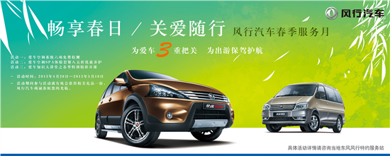 活動(dòng)主題:“暢享春日 關(guān)愛(ài)隨行”風(fēng)行汽車(chē)2013年春季服務(wù)月活動(dòng)。