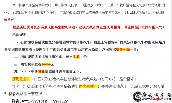 2014年4月2日武鳴三月三歌圩文化節(jié),廣西興弘江淮汽車將攜家族成員:樹立城市SUV新標(biāo)桿—瑞風(fēng)S5、國內(nèi)MPV**品牌—瑞風(fēng)、三車合一 全能商務(wù)—新和悅RS以及榮獲“年度中級車”大獎的和悅A30為您展示品質(zhì)江淮 中國風(fēng)尚的魅力。
