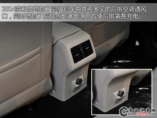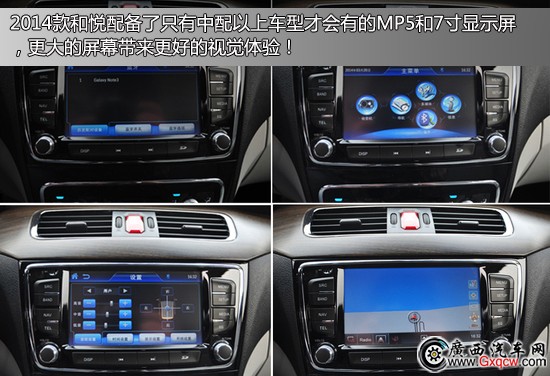 其一:為了營造更好的視覺體驗,我們?yōu)?014款和悅配備了只有中配以上車型才會有的MP5和7寸顯示屏,此外,像導(dǎo)航,藍(lán)牙電話,外接音頻接口豐富IPOD USB AUX一應(yīng)俱全。