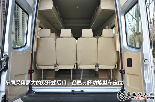 車身部分與奔馳凌特采用了相似的低風(fēng)阻腰線和炫黑防擦條組合設(shè)計,使車身線條流暢并有效地減小風(fēng)阻和降低油耗。車尾采用高大的雙開式后門和與奔馳凌特相似的弧線后窗,凸顯其多功能商用平臺的歐系定位。