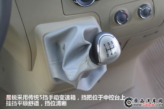 星銳內(nèi)部設(shè)計了很多儲物空間,僅中控臺一面就有很多個性化的儲物格,另外手套箱的內(nèi)部儲物空間比較大,可以放下較多的物品。除此之外,星銳采用傳統(tǒng)的五速手動變速箱,換擋手柄也設(shè)計在中控臺上面,這種設(shè)計方式酷似很多MPV車型。