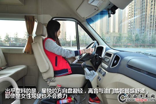 此次我們試駕的這款星銳是2.8T柴油發(fā)動機(jī),*大功率為88Kw/rpm;*大扭矩為280N.m/rpm,這款車的功率和扭矩較大,而且所需的轉(zhuǎn)速也比較低,可以在低速發(fā)揮出非常優(yōu)秀的動力性能。 出乎意料的是,星銳的方向盤很輕,離合與油門踏板腳感舒適,即使是女性駕駛也不會費(fèi)力。