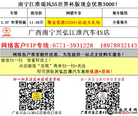 更多資訊致電江淮網(wǎng)銷部:0771-3931228,一站式服務(wù)一步到位。興弘網(wǎng)銷部(網(wǎng)絡(luò)超前、降價超前、禮物超前、服務(wù)超前)全新優(yōu)惠政策一享到底,讓您開開心心把車買回家!