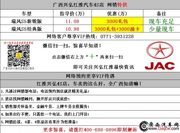 更多資訊致電江淮網(wǎng)銷部:0771-3931228,一站式服務(wù)一步到位。興弘網(wǎng)銷部(網(wǎng)絡(luò)超前、降價超前、禮物超前、服務(wù)超前)全新優(yōu)惠政策一享到底,讓您開開心心把車買回家!