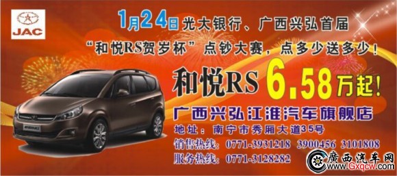 2015.1.24-25日,廣西興弘江淮汽車和光大銀行合作,舉辦首屆購(gòu)“和悅RS”點(diǎn)鈔大賽,點(diǎn)多少送多少活動(dòng),購(gòu)車享受優(yōu)惠的同時(shí),還可以參與點(diǎn)鈔大賽,這樣的活動(dòng),無(wú)論從哪方面,收益的都是客戶,相信有實(shí)力的你,趕緊行動(dòng)吧。