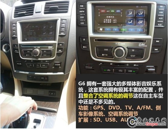 中控臺(tái)的影音娛樂系統(tǒng)應(yīng)該是G6的*大亮點(diǎn)了,它完全展示了比亞迪在電子產(chǎn)品上的特長(zhǎng)。這套系統(tǒng)采用了一塊高分辨率液晶屏,通過實(shí)測(cè),這個(gè)液晶屏在強(qiáng)光下也具有不錯(cuò)的顯示效果,沒有出現(xiàn)反光問題。