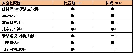 安全配置方面,比亞迪L3與長城C30都全系標(biāo)配了前排SRS雙安全氣囊、安全帶未系報(bào)警系統(tǒng)、高位剎車燈、ABS+EBD、兒童安全鎖、可潰縮吸能轉(zhuǎn)向柱等主流安全配置,L3還增加了潰縮吸能式制動(dòng)踏板,為車主提供了完備的安全防護(hù)。此外,前大燈高度可調(diào)等緊湊型車中少有的配置,在L3上也成了標(biāo)配。自動(dòng)開啟的感應(yīng)大燈、倒車可視系統(tǒng)等科技配置也一應(yīng)俱全,這也是長城C30所不具備的。