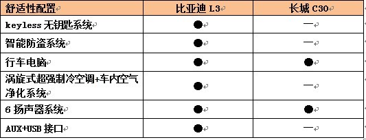 豐富齊全的科技配置可以說是L3的殺手锏。L3全系標(biāo)配了Keyless無鑰匙系統(tǒng),只需攜帶智能鑰匙便可實(shí)現(xiàn)無鑰匙進(jìn)入、一鍵啟動(dòng)、電子防盜、尋車等功能。而長城C30僅配備了普通的遙控鑰匙,便利性及科技感不及比亞迪L3。