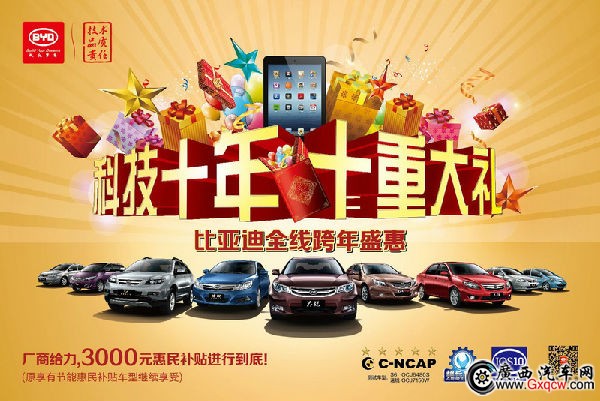 比亞迪全線跨年盛惠重磅來襲!為感恩廣大用戶,比亞迪于2013年10月14日――2014年1月31日舉行“科技十年 十重大禮”比亞迪全線跨年盛惠活動,覆蓋旗下所有車型。