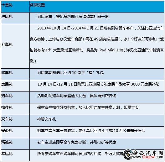 本次感恩活動不僅覆蓋全車系、時長近4個月,而且力度大: 10月14日-2013年12月31日,購買比亞迪原節(jié)能惠民車型,惠享廠商3000元惠民補貼;整個購車過程中提供進店禮、試車禮、惠民禮、購車禮等十重超值大禮;購買比亞迪旗下任意車型,可立享汽車三包政策,更優(yōu)享比亞迪4年或10萬公里超長質(zhì)保;上傳與心儀愛車的店內(nèi)合影還可參加微博抽獎活動,有機會贏iPadMini,中獎率高達平均每天一臺。立即參加