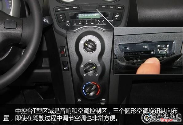 T型中控臺(tái)功能分區(qū)簡(jiǎn)潔清晰,上部分音響區(qū),下方為空調(diào)控制區(qū)。音響區(qū)除了收音機(jī)功能外,還配有SD卡口、USB接口及AUX接口,擴(kuò)展功能非常豐富。