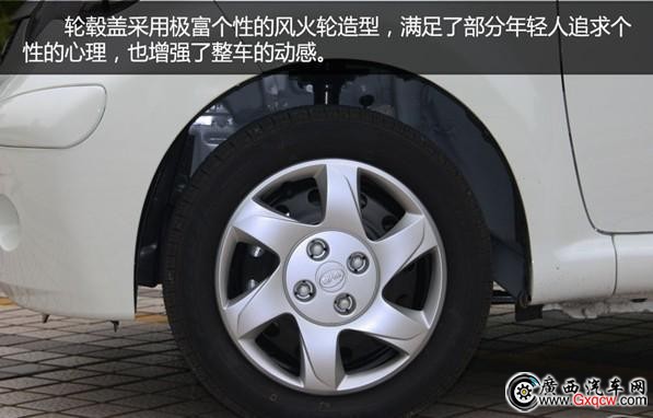 本次試駕的全新F0鉉酷型輪胎規(guī)格為165/60 R14,鋼輪轂配有“風(fēng)火輪”造型的輪轂蓋,使得整體看起來(lái)更具動(dòng)感,剎車系統(tǒng)采用的是前通風(fēng)盤(pán)式后鼓式的設(shè)計(jì)。