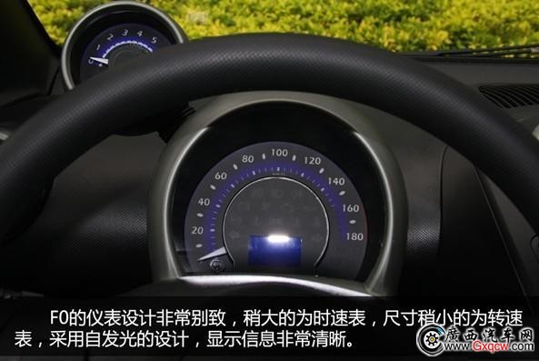 F0的自發(fā)光儀表清晰度和美觀程度都令人滿意,在質(zhì)感上優(yōu)于很多同級(jí)別小車。在方向盤(pán)后的半圓形速度表左上方生出一只耳朵,這個(gè)酷酷的轉(zhuǎn)速表在自動(dòng)擋車型里也是標(biāo)配。