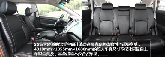 首先,寬大舒適的駕乘空間是最能讓車(chē)主直觀的感受到S6的“越級(jí)享受”的地方。作為城市多功能SUV,S6在空間舒適性方面可謂下足功夫,車(chē)身尺寸達(dá)到4810mm×1855mm×1680mm,長(zhǎng)達(dá)2720mm的軸距營(yíng)造出超大而又舒適的車(chē)內(nèi)空間,如此尺寸不僅讓同級(jí)自主車(chē)望塵莫及,甚至超越不少合資車(chē)型,可謂名副其實(shí)的大塊頭、全尺寸SUV。