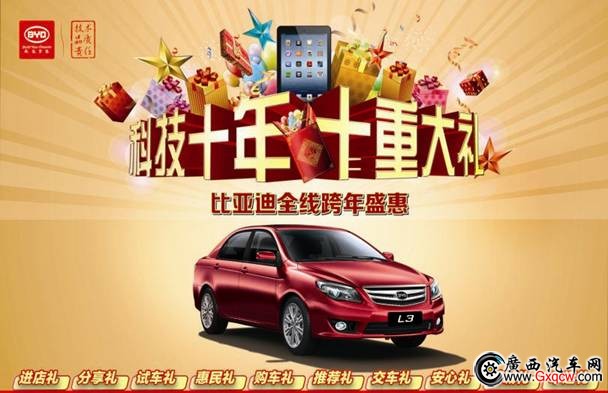 2013年是比亞迪進(jìn)入汽車產(chǎn)業(yè)第十年,為感恩十年來廣大消費者的支持,2013年10月14日—2014年1月31日期間,比亞迪舉辦了科技十年感恩回饋的跨年盛惠活動。比亞迪L3作為此次盛惠活動主力之一,將享有多種購車實惠。活動期間消費者可享包括:進(jìn)店禮、試車禮、購車禮等多重超值大禮, 以及汽車三包政策、比亞迪4年或10萬公里超長質(zhì)保。