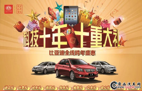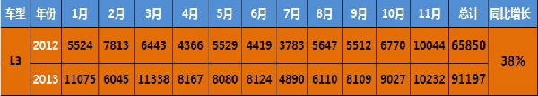 2013年是比亞迪進(jìn)入汽車產(chǎn)業(yè)第十年,為感恩十年來廣大消費(fèi)者的支持,2013年10月14日—2014年1月31日期間,比亞迪推出了“科技十年 十重大禮”感恩回饋跨年鉅惠活動(dòng),與消費(fèi)者共贏。作為此次鉅惠活動(dòng)主力之一的比亞迪新3系銷量喜人,其中比亞迪L3熱銷勢(shì)頭強(qiáng)勁, 11月銷量再度過萬,熱銷10232臺(tái), 1-11月累計(jì)91197臺(tái),同比增長(zhǎng)38%。目前L3已成為消費(fèi)者歲末購車**選擇之一。