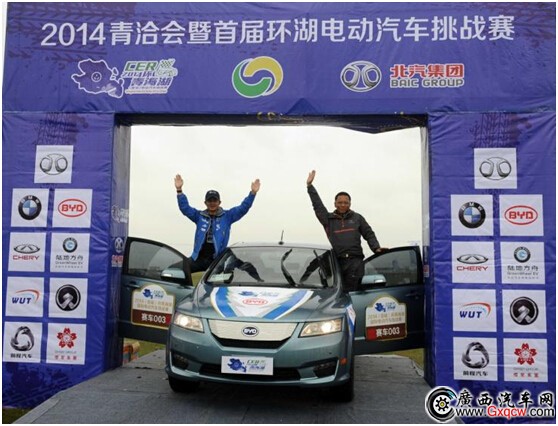 專業(yè)賽車手何勇和董彤駕駛e6抵達(dá)終點(diǎn)