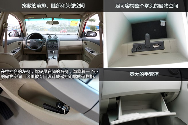 再來(lái)看看G3R天賦異稟的各項(xiàng)空間優(yōu)勢(shì)吧:從資料來(lái)看,G3R的長(zhǎng)寬高分別達(dá)到4380×1705×1490mm,再加上2600mm的超長(zhǎng)軸距,在同級(jí)別車型中相當(dāng)稀有,如此有競(jìng)爭(zhēng)力的空間優(yōu)勢(shì)令G3R堪當(dāng)大任,也讓同級(jí)別車型花容失色。除了這些顯性的空間,G3R還擁有多項(xiàng)隱性的空間優(yōu)勢(shì):寬敞的前排、腿部和頭部空間,足可容納整個(gè)拳頭的儲(chǔ)物空間,寬大的手套箱,令人愛(ài)不釋手;中控臺(tái)左側(cè)、駕駛員右腿右側(cè),隱藏著一個(gè)專門放置遙控鑰匙的小儲(chǔ)物格,可謂人性化十足。獨(dú)坐車內(nèi),寬敞的空間、舒適的坐姿、愜意的享受,實(shí)可說(shuō)是流連忘返、美不勝收,再開(kāi)啟音樂(lè)播放器,陶冶下美妙的音樂(lè),足以羨煞旁人!