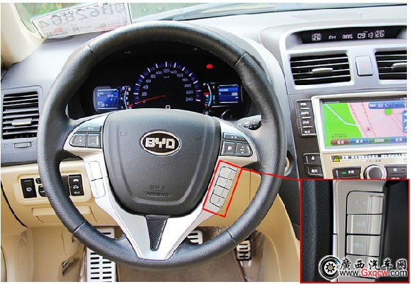 比亞迪G6的多功能儀表盤大大提升了內(nèi)飾科技感,該儀表盤具有22級(jí)的背光調(diào)節(jié)功能,儀表盤兩側(cè)分別擁有4.3寸液晶屏,可顯示多種行車信息,非常實(shí)用。多功能一體機(jī)支持的功能也非常強(qiáng)大,在擁有導(dǎo)航、DVD、電視接收、SD卡讀取、USBAUX接口讀取、藍(lán)牙手機(jī)連接功能的基礎(chǔ)上,還可對雙區(qū)自動(dòng)空調(diào)進(jìn)行控制,非常直觀方便。