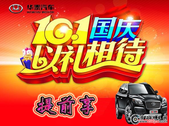 華泰汽車(chē)在十一黃金周來(lái)臨之際,特為廣大車(chē)友解決購(gòu)車(chē)煩惱,特推出“金秋國(guó)慶以禮相待提前享”,讓廣大消費(fèi)者盡享華泰汽車(chē)為您帶來(lái)的無(wú)限購(gòu)車(chē)樂(lè)趣與優(yōu)惠!