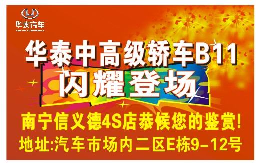 2011年4月14日-17日,第十七屆廣西汽車春季交易會(huì)在南寧市安吉大道41號(hào)廣西汽車交易市場(chǎng)內(nèi)隆重舉行。在車展期間,華泰汽車首款中高級(jí)轎車B11將在南寧市信義德4S店閃耀登場(chǎng),現(xiàn)場(chǎng)可接受預(yù)訂!歡迎廣大車友蒞臨鑒賞