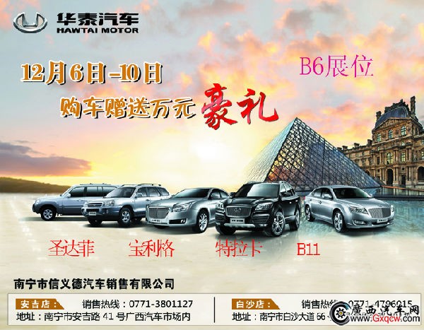 為喜迎第五屆中國-東盟(南寧)國際汽車展覽會12月6日-10日隆重舉行,華泰汽車真情回饋廣大客戶,車展期間購車可享受萬元豪禮優(yōu)惠,每日將推出兩臺寶利格特價車,蒞臨B6展位賞車購車顧客朋友即可獲贈精美禮品一份!垂詢熱線:0771-3801127 地址:南寧市安吉路41號廣西汽車市場內
