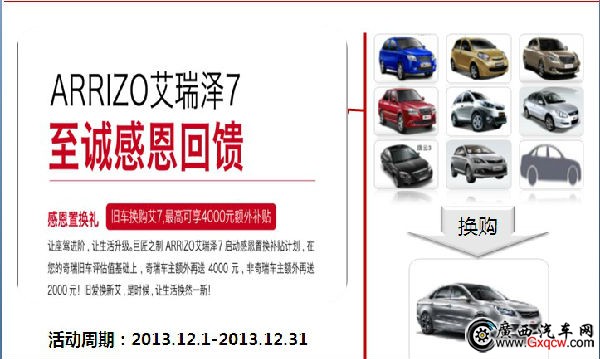 柳州鑫廣達(dá)奇瑞為感恩客戶,在激情的12月,特別推出舊車置換活動(dòng)。過(guò)年開(kāi)新車,還等什么呢,趕緊趕快,機(jī)會(huì)不容錯(cuò)過(guò)!