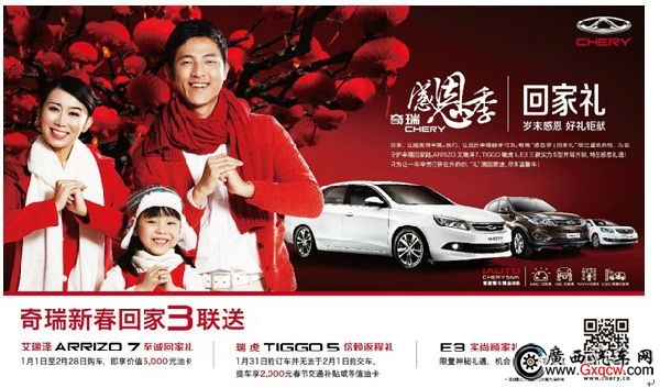 凡在2014年1月1日-2月28日購買奇瑞艾瑞澤7的客戶,將享受奇瑞汽車贈送的價值5000元油卡的“至誠回家禮”。不難看出,在馬年新春,奇瑞通過向新任艾瑞澤7車主提供油卡大禮的方式,助力車主駕駛愛車“回家過年”,溫情回饋消費者的厚愛。