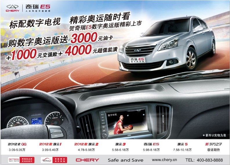 在2012年倫敦奧運會即將開啟之際,自主家轎市場炙手可熱的“人本科技中級家轎”——奇瑞E5提前發(fā)力,于近日正式推出奇瑞E5數(shù)字奧運版,讓愛好體育的駕車人士把奧運節(jié)目輕松“搬”進車內(nèi),隨時隨地觀賞高清畫質(zhì)數(shù)字奧運賽事。奇瑞E5數(shù)字奧運版市場價為69800元,現(xiàn)在購車即可享3000元加油卡及1000元交強險,更有4000元超值裝潢大禮奉送,感興趣的消費者可垂詢柳州奇瑞4S店