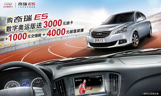 現(xiàn)購奇瑞E5數(shù)字奧運版,即可享價值8000元優(yōu)惠。3000元油卡,解除消費者油費的后顧之憂;1000元交強險免卻消費者多余煩惱;4000元裝潢大禮包讓消費者暢享驚喜好禮