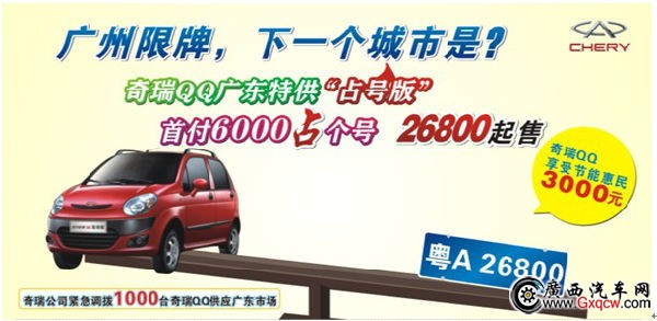 針對廣州限牌問題,記者有幸電話采訪了奇瑞銷售公司總經(jīng)理鄭兆瑞先生,鄭總詳細闡述了在當前形勢下奇瑞公司如何面對廣州限牌的一些列措施。鄭總表示:“3小時的反映時間對我們來說確實少了點,本次廣州限牌QQ車為何能銷售一空?總結(jié)分析很簡單,奇瑞QQ是奇瑞公司最成熟的精品小車,2012款QQ更是經(jīng)過多項升級,性能穩(wěn)定,油耗低,最低百公里油耗3.05升,維修保養(yǎng)成本低,同時還享受國家節(jié)能惠民補貼3000元。為滿足廣東市場需求,奇瑞公司在聽聞廣州限牌后緊急調(diào)撥1000臺廣東省特供“占號版”QQ供應(yīng)廣東市場。特供“占號版”QQ市場售價26800元起,辦理金融貸款首付6000元即可開回家,只要花6000元就能先占個號。”