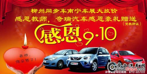 濃情九月謝恩師,款款大禮見真情,在教師節(jié)來臨之際,柳州鑫廣達奇瑞汽車4S店“奇瑞感恩謝恩師,同步南寧車展大放價”的教師節(jié)購車獻禮活動。2012年9月7日―9日,南寧*大型車展――北部灣(南寧)第九屆汽車展將在南寧國際會展中心室外廣場盛大舉行,柳州奇瑞與南寧奇瑞是一家,車展期間,柳州客戶在柳州奇瑞店購車同享南寧車展大放價政策,憑教師證購車的客戶還可獲贈感恩教師豪華大禮包一份。