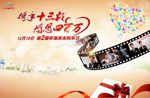 2012年12月18日,奇瑞汽車(chē)首輛車(chē)下線(xiàn)十三周年之際,奇瑞汽車(chē)在太平洋汽車(chē)網(wǎng)推出“攜手十三載 感恩四百萬(wàn)”活動(dòng)http://play6.pcauto.com.cn/pcauto121001/,向廣大消費(fèi)者展現(xiàn)了自身對(duì)消費(fèi)者無(wú)限的感恩之情。