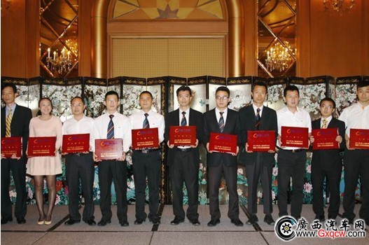 圖為梁文政經(jīng)理代表廣西弘通上臺(tái)領(lǐng)取五星獎(jiǎng)牌