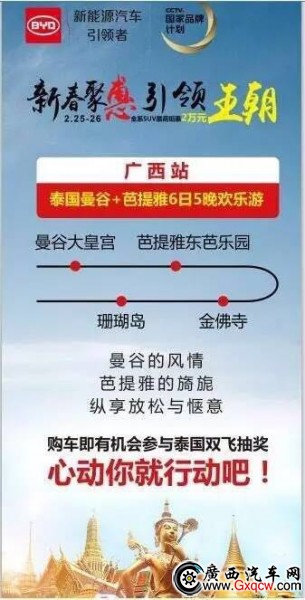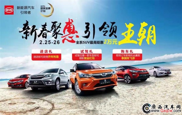 比亞迪百色佳宜4S店發(fā)大招了,2月25日-26日,佳宜新年首場大型團購會“新春聚惠引領王朝” ,全系SUV*高鉅惠2萬元,現(xiàn)場訂車還有機會贏取泰國雙飛歡樂游。