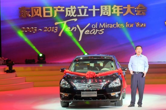 2013年6月16日,東風(fēng)日產(chǎn)成立十周年大會(huì)在廣州舉行。大會(huì)現(xiàn)場(chǎng)現(xiàn)場(chǎng),一輛剛剛從生產(chǎn)線上開出來(lái)的新世代天籟,緩緩駛出舞臺(tái)。而這正是東風(fēng)日產(chǎn)生產(chǎn)的第450萬(wàn)輛整車。在成立十周年之際,東風(fēng)日產(chǎn)的成功不僅見(jiàn)證了中國(guó)汽車界的成熟與發(fā)展,更迎來(lái)了一個(gè)全新時(shí)代的競(jìng)爭(zhēng)與挑戰(zhàn)。