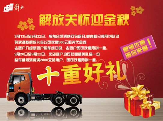 喜迎中秋,解放關(guān)懷!鑫廣達(dá)南寧解放4S店為答謝一直給予解放品牌支持的所有客戶朋友,激情放送溫馨好禮,活動(dòng)時(shí)間9月1日至9月30日,敬請(qǐng)觀注: