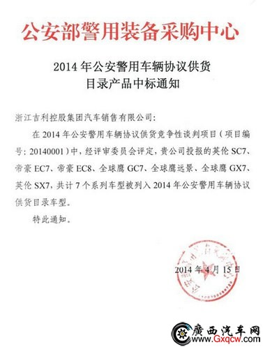 浙江在線**從吉利控股集團(tuán)公關(guān)部了解到,浙江吉利控股集團(tuán)汽車銷售有限公司投報(bào)的英倫SC7、帝豪EC7、帝豪EC8、**鷹GC7、**鷹GX7、英倫SX7,共計(jì)7個(gè)系列車型被列入2014年公安警用車輛協(xié)議供貨目錄車型。這也是繼今年帝豪成為2014年APEC高官會官方用車后,吉利汽車的又一件大事。