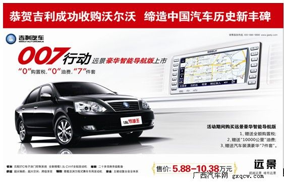 近日,編者從吉利方面獲悉,遠(yuǎn)景豪華智能導(dǎo)航版即將上市,其配備的GPS導(dǎo)航、可視倒車?yán)走_、真皮坐椅,給廣大用戶提供了更具個性化、更豐富的產(chǎn)品選擇。此外,我司還為新車型上市量身定做了送購置稅、油費、汽車裝潢套裝等近萬元優(yōu)惠的“007”行動。