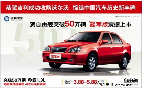 業(yè)界人士表示,如今自由艦的累積銷售達50萬輛,這不僅是自由艦作為一款車型的成功,還書寫了自主品牌車型銷量奇跡,也成為自主品牌車型為數(shù)不多的幾款銷量破50萬輛的車型。此次吉利在傳統(tǒng)的銷售淡季推出的 自由艦冠軍版車型,打出了極具吸引力的價格,加上自由艦長期積累的良好市場口碑,我們有理由相信,自由艦還將續(xù)寫和創(chuàng)造另一個奇跡。