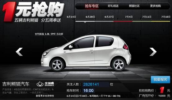 “10天一共吸引了近300萬網(wǎng)友的廣泛關注,網(wǎng)絡4S店的客服每天都會收到幾百條在線咨詢信息,活動的火熱程度大大出乎我們的意料! 吉利**鷹品牌事業(yè)部負責人指出:自6月1日至7月18日,吉利**鷹品牌啟動了1元搶購吉利熊貓活動以來, 1元搶拍熊貓成為目前網(wǎng)上最時尚、最具吸引力的網(wǎng)絡拍拍活動。