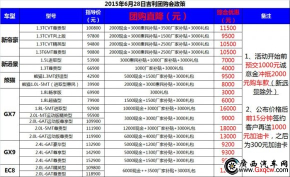 活動(dòng)車型:新帝豪、新遠(yuǎn)景、GX7、熊貓、GX9、EC8等熱銷車型