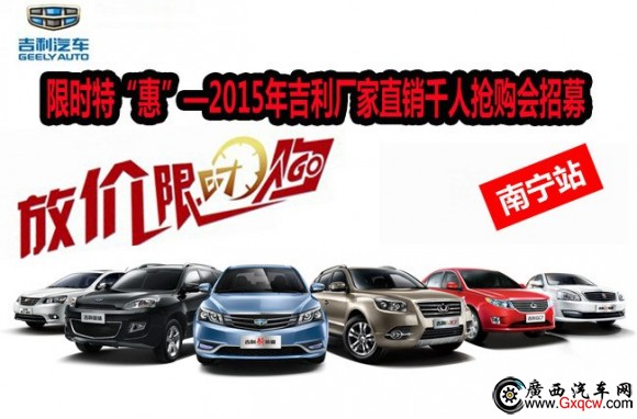 為了能夠讓廣大網(wǎng)友買到*低價(jià)的愛車,廣西開心吉利4S店聯(lián)手南寧開河吉利4S店于2015年06月28日(周日)14:30-17:00為廣大網(wǎng)友組織勁爆直銷會(huì),吉利全系車型限時(shí)優(yōu)惠鉅獻(xiàn)活動(dòng)。通過這次活動(dòng),讓客戶真正買到舒心,買到實(shí)惠,且到場(chǎng)100%有禮,現(xiàn)場(chǎng)更有機(jī)會(huì)贏取大禮包,特價(jià)車驚爆驚喜等眾多傾情禮遇,如此機(jī)遇怎能錯(cuò)過?還在價(jià)格邊緣猶豫的您趕快報(bào)名參加活動(dòng)!歡迎大家踴躍報(bào)名!