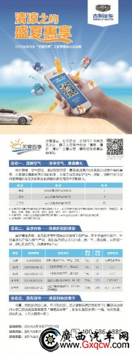 健康呼吸,暢快出行。吉利汽車針對(duì)夏季特征推出以空調(diào)檢測(cè)為主的清新免檢活動(dòng),及時(shí)發(fā)現(xiàn)車內(nèi)亞健康環(huán)境,同時(shí)推出更換PM2.5空調(diào)濾清器有獎(jiǎng)回饋活動(dòng),帶給你車輛清新空氣的同時(shí),還可參加抽獎(jiǎng),贏取千元購(gòu)物券。