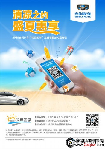 面對(duì)高溫多雨的惡劣環(huán)境,吉利汽車針對(duì)剎車片、空調(diào)冷媒、雨刮等夏季常用品類進(jìn)行季節(jié)性的促銷活動(dòng),讓你在這個(gè)炎炎夏季,勁享超爽清涼讓利。