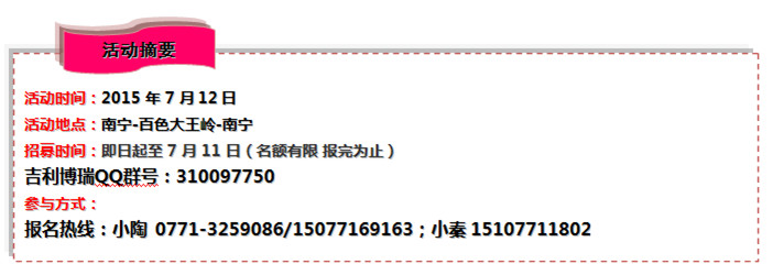 那就帶Ta一起漂流去吧! 開心吉利與您相約2015年7月12日(周日),探詢一場“穿越原始森林-未歷之征——吉利博瑞探享漂流自駕游”之旅!只要你是吉利博瑞車主,只要你熱愛自駕游,那么還等什么,讓博瑞帶您來場說走就走的旅行,體驗自然探詢之旅吧!